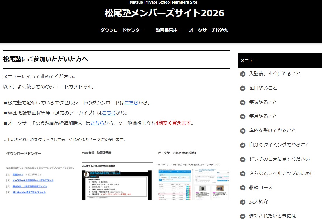 ▲塾生向けクローズサイトです。隠居せどりの考え方/やり方/日々の作業の全てが分かるので、わたしのせどりを完コピできます。