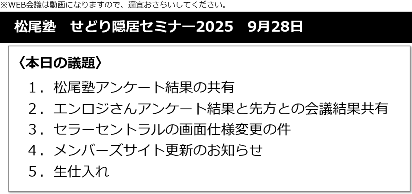 塾生の方の声もこんな感じです。※先日、現在の在籍生の方に「入塾前と入塾後でどう変わりましたか?」と聞いてみました。 ✔参加後の活動イメージ さて、せどりで、結果が出る人と出ない人の差は何だと思いますか?ここでのわたしの答えは”見直しをするかどうか”です。見直しをして、上手くいったことは続け、上手くいかなかったことは直す。 これを繰り返すことで、成果が出る可能性が高まります。なので、松尾塾の活動は、見直しを組み込んだ月次サイクルをまわします。 参加直後は、まず塾生向け教材サイトでインプットしていただきます。 そして、実践し、月末の実績提出ののち、わたしからフィードバックをします。 >>フィードバック会議(月1回) ▲塾生全体の会議です。提出概況に続き、個別にコメントしていきます。 ところで、そもそも自分はこのペース(サイクル)にのれるだろうか?そんな不安を感じられるかもしれません。大丈夫です。しっかりサポートします。LINEで個別サポートします。 質問回数制限付きの塾やコンサルも多いですが、回数無制限です。※なので、形式上は”グループコンサル”ですが、実体は”個別コンサル”です。 >>LINEによる個別サポート(回数無制限) ▲このような初歩的な問合せでも、ていねいにお答えします。 ✔競争優位を作るために せどりは競争だと思っています。意識しない人は飽和に巻き込まれます。Amazonの商品ページをみれば明白です。お客さんは、並んでいる出品者の商品から比較購買しています。 なので、他のせどらーと差がつくものをどれだけ持てるかが、安定的に結果を出す分かれ目です。松尾塾では、下記の3つで、構造的な競争優位を作ります。 >>反則レベルの商品リサーチツール「デイせど」 >>仕入れを超効率化するツール「オークサーチ」 >>価格・品質・納期で超優秀なFBA納品代行社 ▲すべての仕入れ商品は代行社を介してFBA納品します。価格・品質・納期で同業他社を圧倒する納品代行社をご紹介します。大きな差別化になります。 また、せどりを取り巻く環境も日々変化しています。常に新しい情報を入れて、せどりをアップデートしていかないと数字は安定しません。その趣旨で、塾内セミナーを開催しています。 >>塾内クローズセミナー(月1回) ✔結果を早く出すために3つの特典を提供 なお、最近は初心者の方の入塾も多くなってきました(7割以上の方がせどり未経験です)。 特にそんな方は、皆と同じコンテンツで学び、実践することで、皆と同じように結果が出せるだろうか?と心配されるかもしれません。ただ初心者でなくても、そもそもスタートライン(=せどりの知識・スキル)は全員異なります。 なので、スタートラインの差を埋めて、初動の足並みをあわせる目的で、個別指導の特典を用意しています。参加して早い段階で下記の2つの特典を使っていただいています。 >>特典1:仕入れ方の個別コンサル(期間中2回)※今だけ ▲「中古家電の最初の仕入れをわたしと一緒にやりましょう」という趣旨で行ってます。作業レベルで、わたしの仕入れ方法を学ぶことができます。 >>特典2:売り方の個別添削(期間中1回) ▲ある程度、仕入れができてAmazonに出品商品が並んだら、出品状況を拝見し個別添削します。 3つめの特典は、わたしが過去販売した商品リストです。 せどりでやってはいけない唯一のことって分かりますか?それは売れない商品を仕入れること。なぜかというと、売れない商品は不良在庫化するからです。不良在庫だけはわたしも打つ手がありません。 >>特典3:現役仕入れ商品リスト500 ▲わたしが今現在、現役で使っている商品リスト500です。せどりの仕入れは一周回ってリスト勝負です。実績をあげていただくため、最優良のリストをお渡しします。 ✔募集要項です それでは募集要項です。 これは、塾の運営サイドの都合が関わっていて、規模を拡大し利益追求したいがためです。そのため、スタッフを雇い、その分の人件費も稼ぐために、時には十分なクオリティでなくても、”弟子”が講師役にまわることになります。 一方で、わたしは、自分が直接教えることにこだわってます。講師はわたしだけです。わたしは隠居の身なので、今以上の規模拡大や利益追求は考えていません。それよりも、直接サポートし、教えるクオリティを保つことを最優先させています。なので、少人数制にこだわっています。 お蔭様で、わたしの塾も発足後、8年で累計350名を超える方に参加いただき、改善を重ね、中身も非常に練れてきました。各人が目標に向かって努力する過程を、お一人お一人ていねいにサポートさせていただきます。 ✔価格について 価格についてです。世の中のせどり塾の相場は50万くらいと言われます。なかなか高額です。これはなぜかというと、講師が相応の時間と労力をかけ、クオリティが担保された学びを提供しているからです。 そんななか、松尾塾はかなりの格安価格でご提供します。 なぜなら、自分