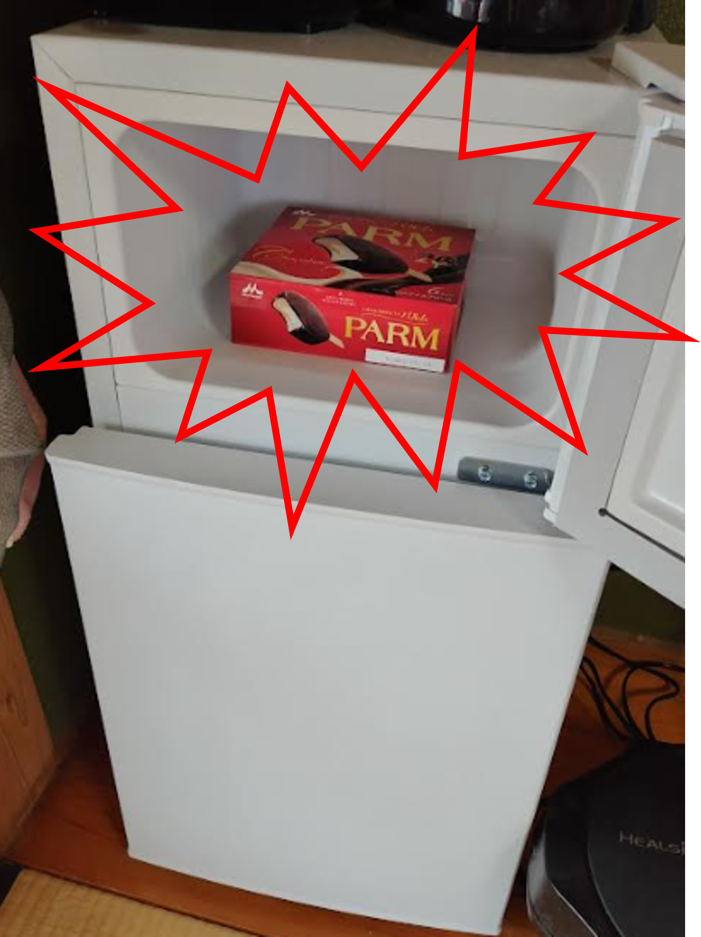 そうしたら、なんということでしょう。扉も、バッチリ閉まります(当たり前)。そして、今回のは冷凍庫付きなので、購入記念にアイスを入れました。