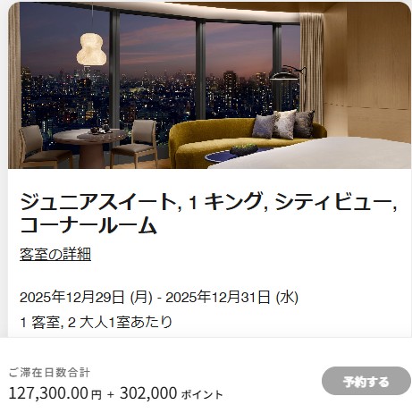 お値段は、12万7300円。くわえてマリオットポイントも30万ポイント消化です。2泊ですのでね。それに一応、スイートですのでね。なかなかです。